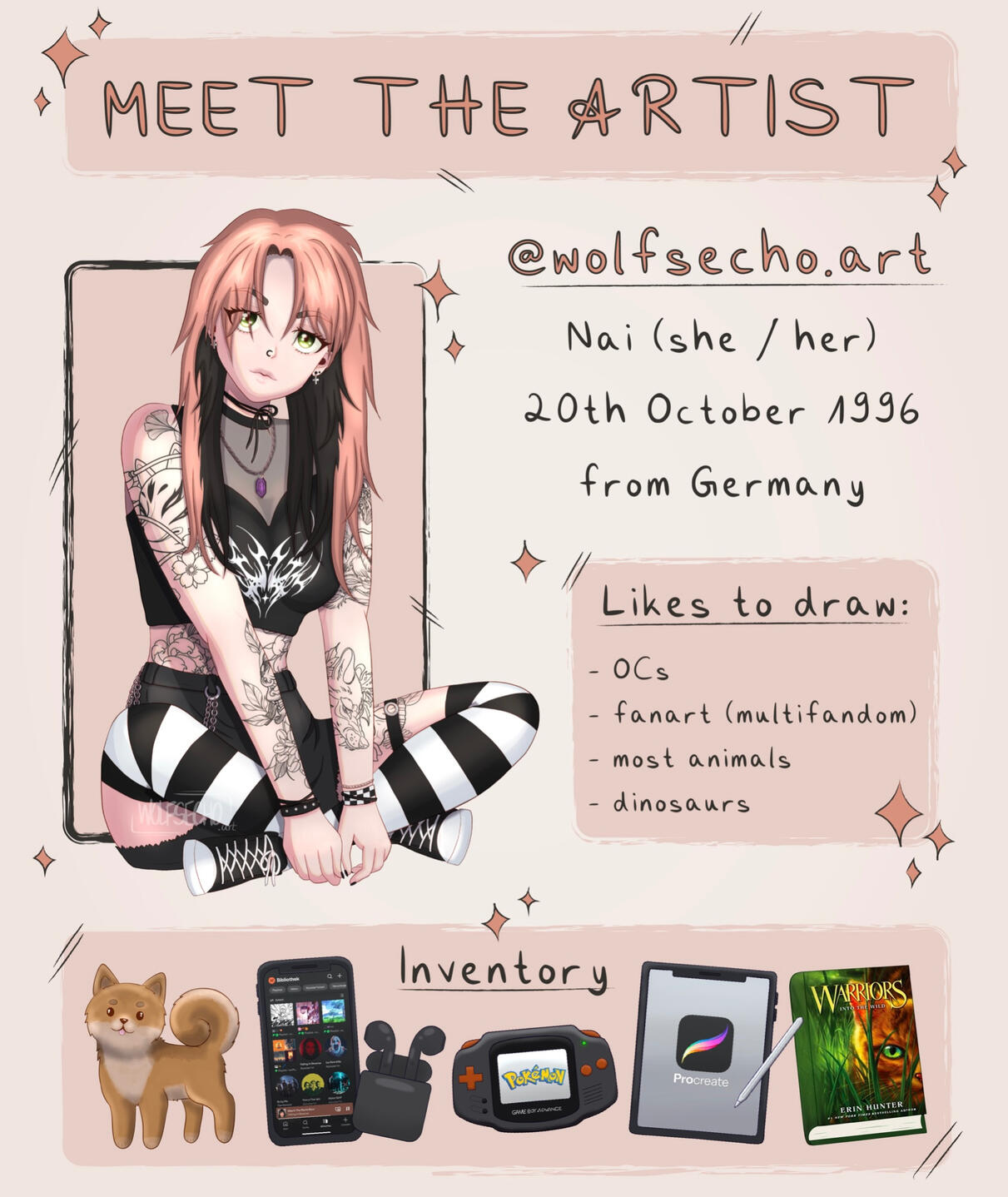 Credit is required when reposting or using your commissioned art (e.g., “Art by @wolfsecho.art”).
